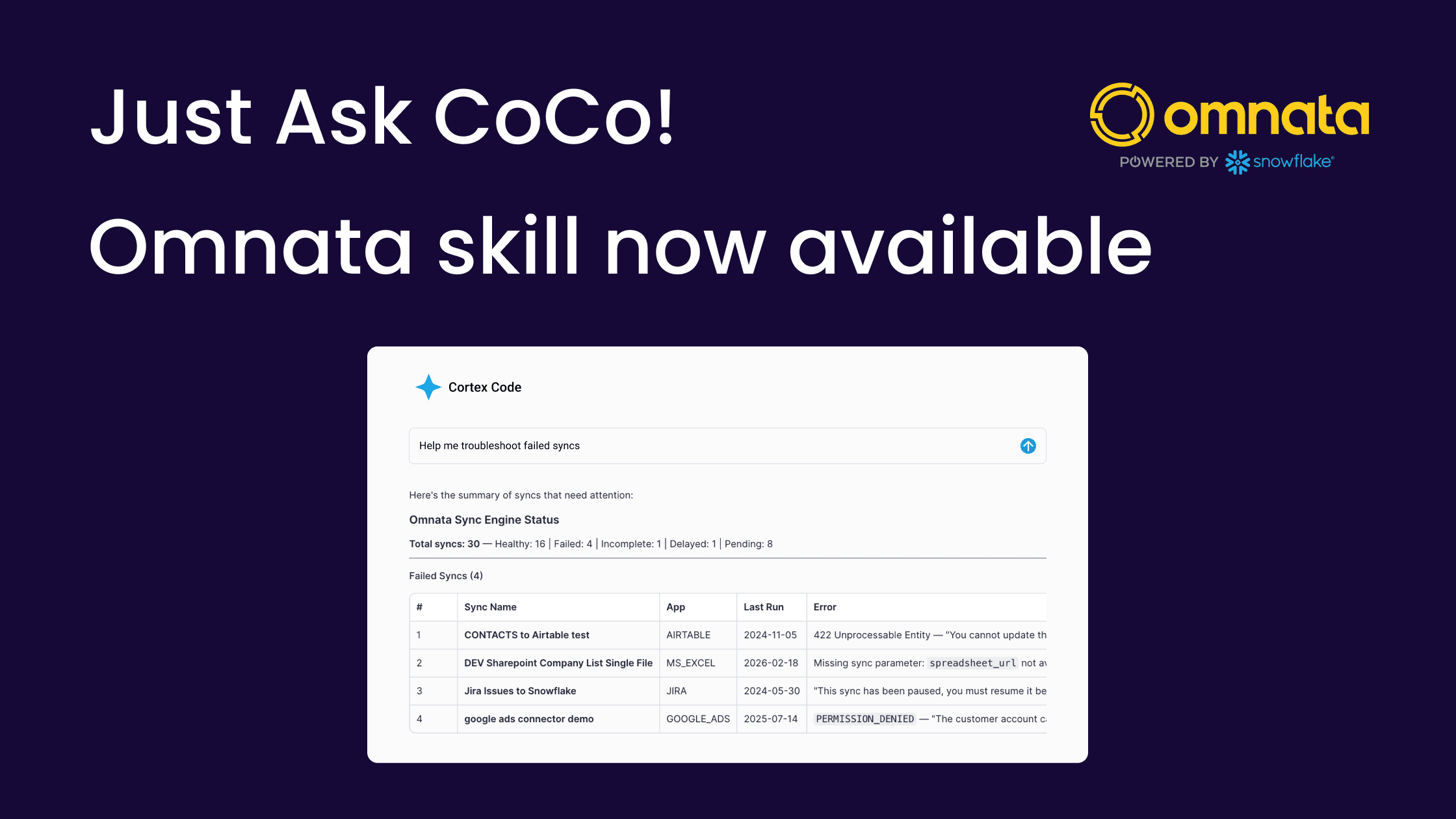 We've built a Cortex Code skill that turns Snowflake's built-in AI assistant into an expert on your Omnata Sync native app. You can monitor syncs, analyse your warehouse costs and get it to perform some actions, however, the biggest value unlock is in troubleshooting.