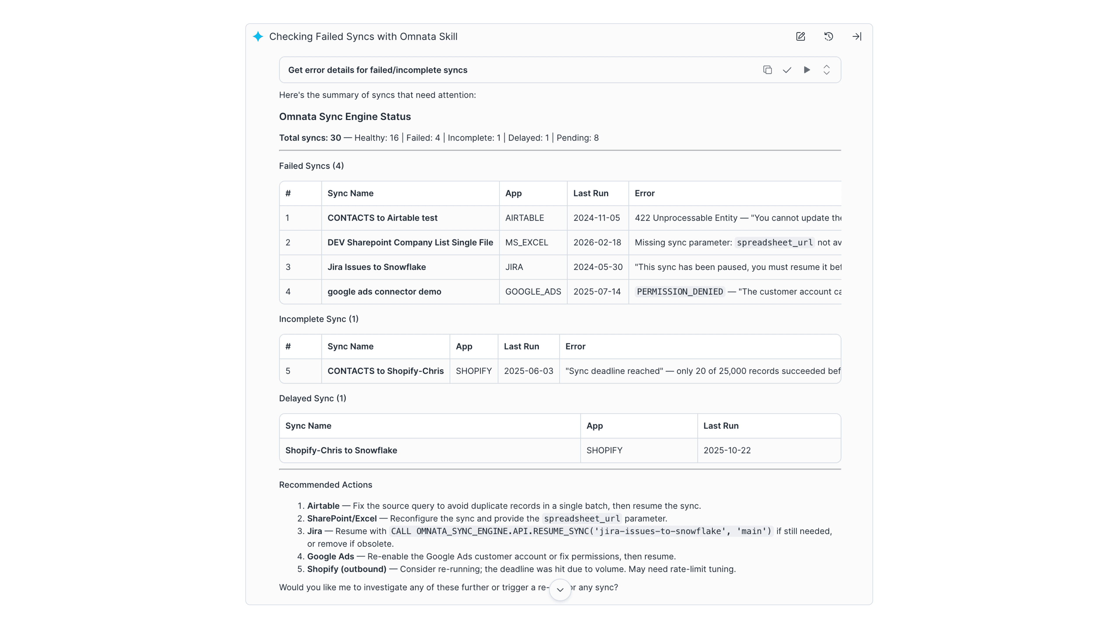 The Omnata Sync Administration Skill encodes all of this expertise and makes it available to any Snowflake user.