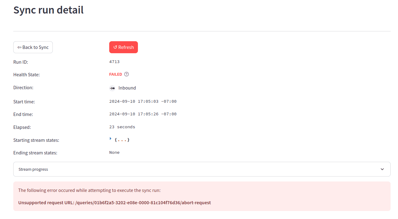 Due to a recent Snowflake behaviour change, syncs that are cancelled in-flight or hit the configured timeout will no longer fail gracefully. The sync run will display the following error message.